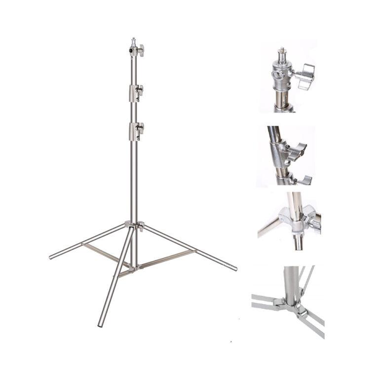 Made from durable metal with a silver finish, the light stand offers excellent stability while remaining lightweight and easy to handle. Its adjustable height design allows precise positioning of lights to achieve the desired lighting effect for portraits, product photography, videos, and live streaming. The secure locking system ensures safe support during extended shooting sessions.
